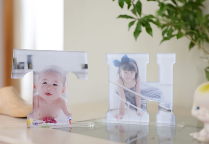 8mmもの厚さのクリアなアクリルにお子さまの今の笑顔を閉じ込めて。イニシャルはお選びいただけます。自立用スタンド付き。