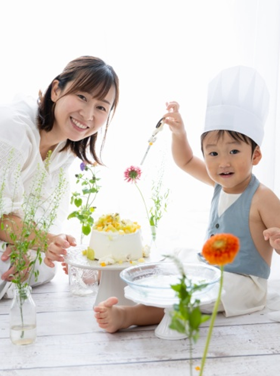 お子さまになるべく負担なく、ケーキ撮影をしっかり楽しみたい方におすすめ。ケーキのシーンで、ファミリーショットも大切に撮影させていただきます。バースデー幕前でのお子さまソロ記念ショットもおまけに撮影プレゼント♪(規定カット内)